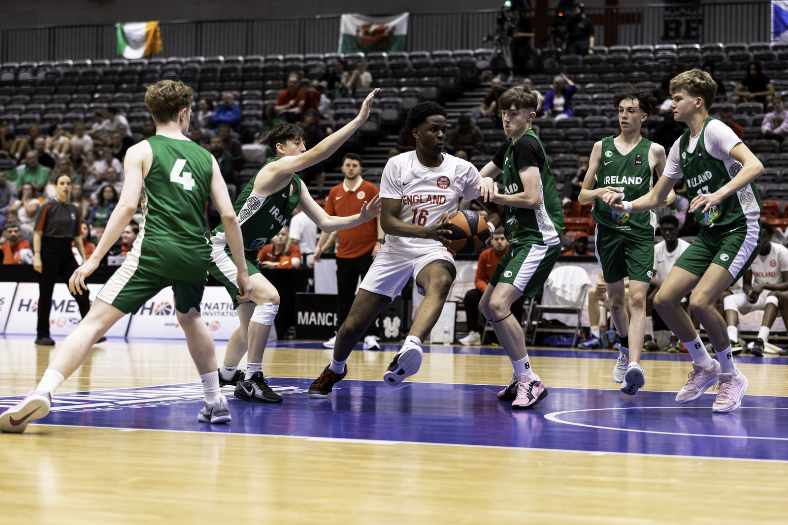 Players can move around the court freely, but must dribble the ball (bounce it whilst running) if they have it in their possession. The ball can also be passed to team-mates.